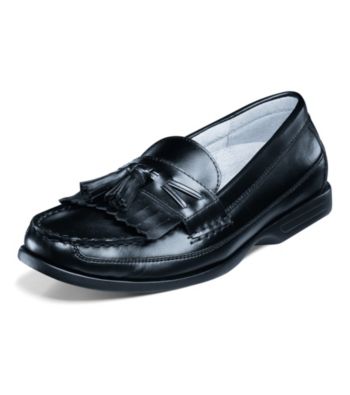 Shoes. Add a classically handsome affect to your wardrobe with this loafer that features a smooth leather upper with tassels. Featured in black Smooth leather upper Fully cushioned footbed Rubber bottom Imported